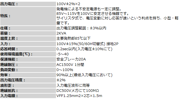 ◎発電機による不安定電源を一定に調整。85V-115Vを100Vに安定させる機器。
